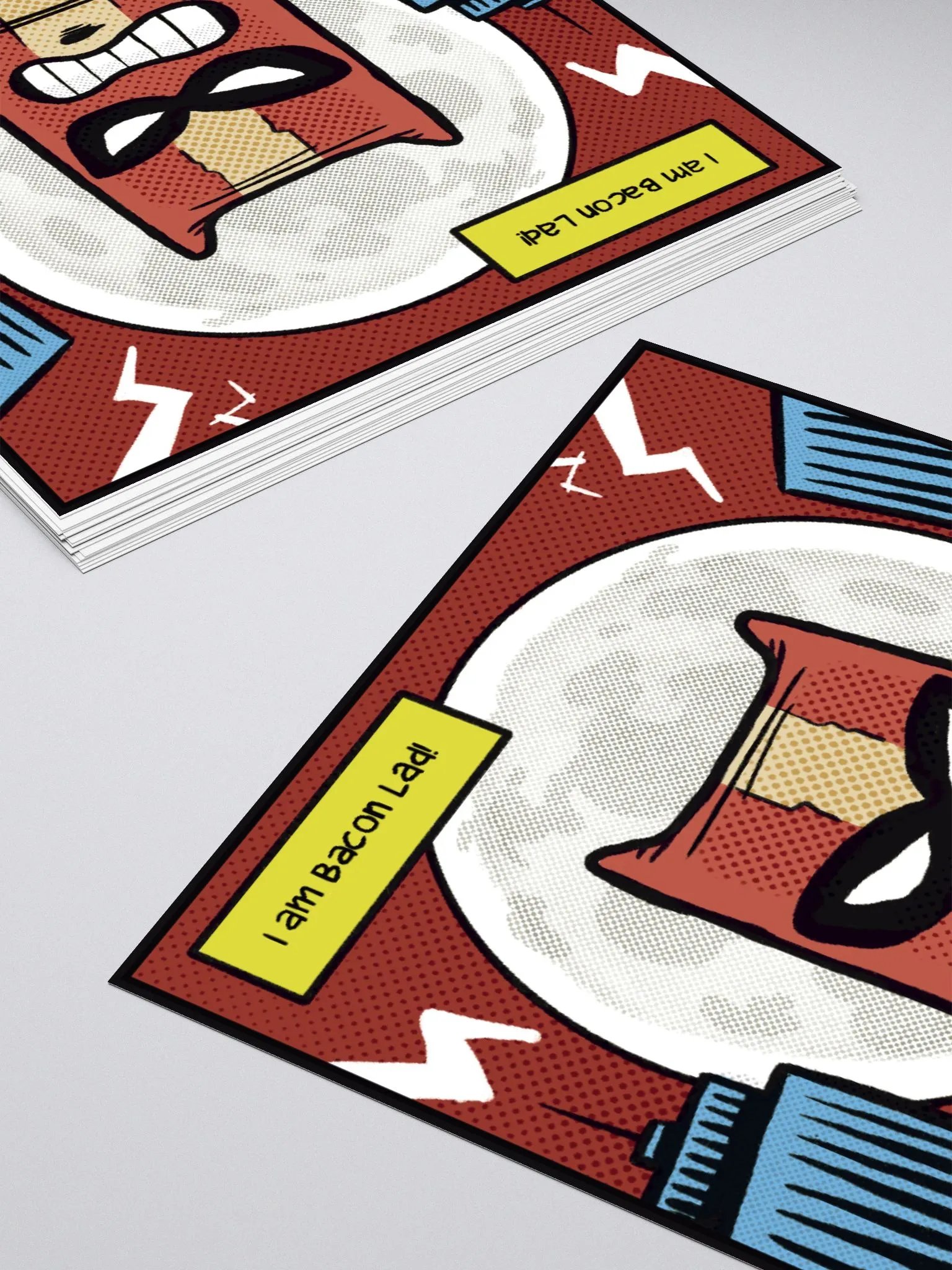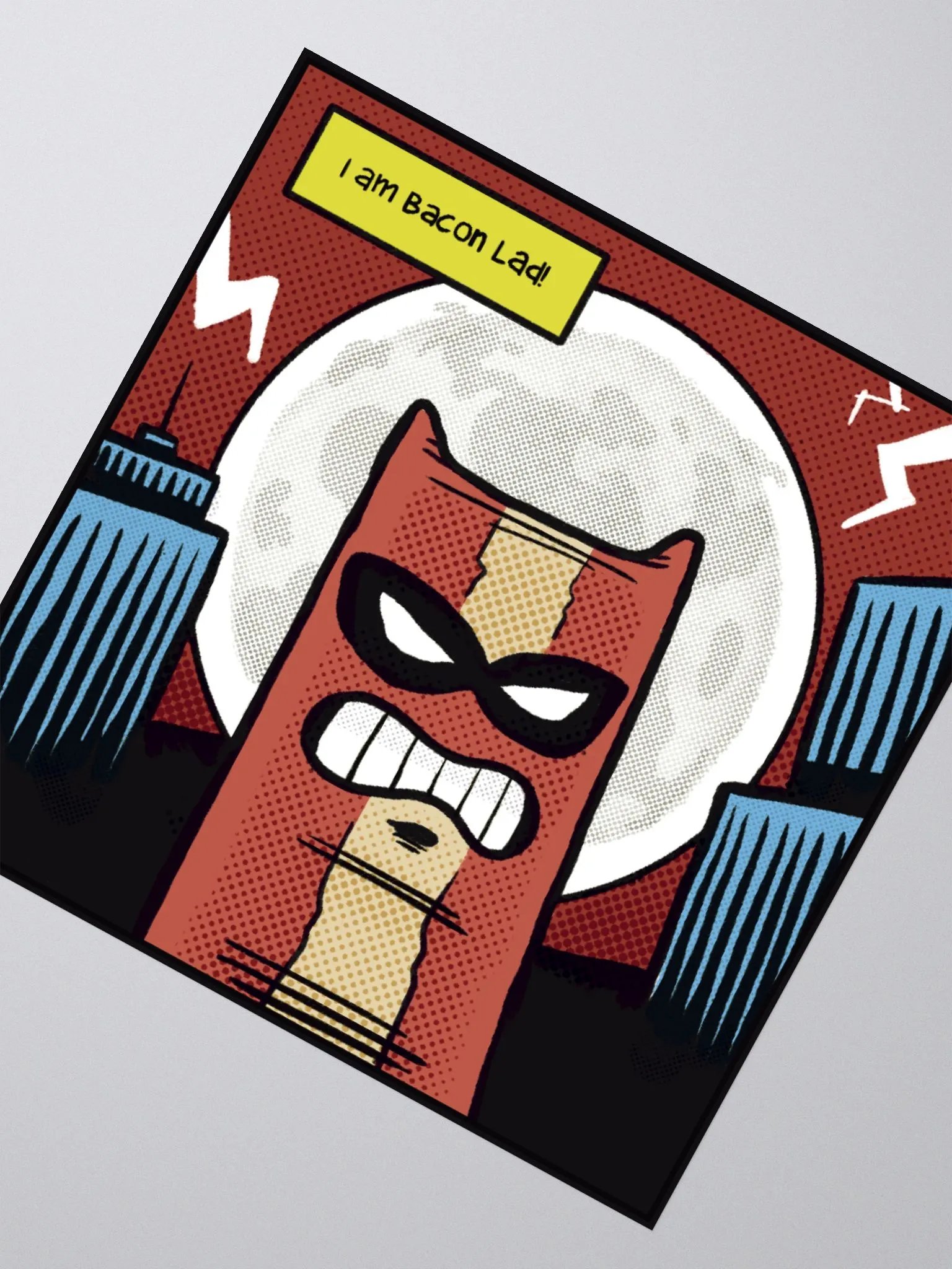 Kiss cut 3"x3" sticker featuring artwork from Bacon Lad: A Crime-fighting Strip.